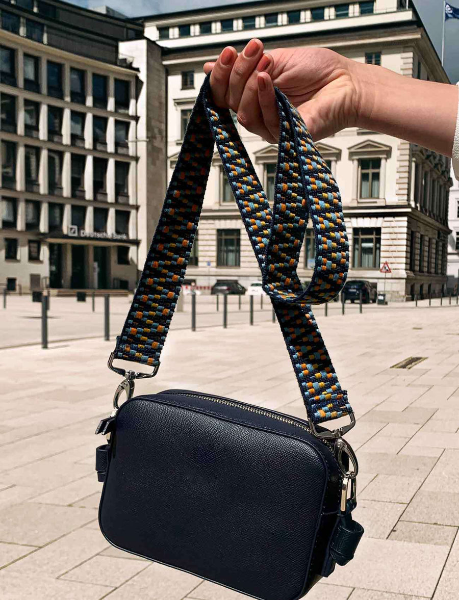 Dunkelblauer Taschengurt mit schoenem Muster