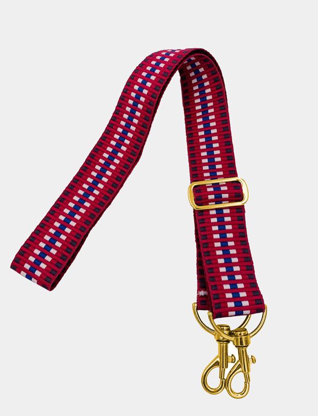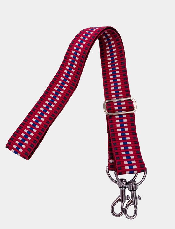 Roter Taschengurt an schwarzer Handtasche